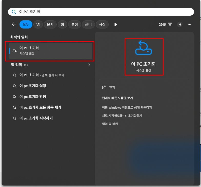 - “이 PC 초기화” 입력