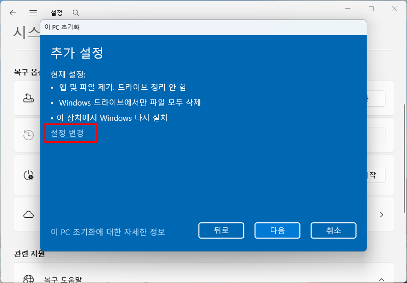 Windows 11 기본 초기화 진입 방법