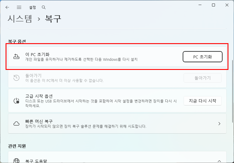 - “이 PC 초기화” 버튼 클릭